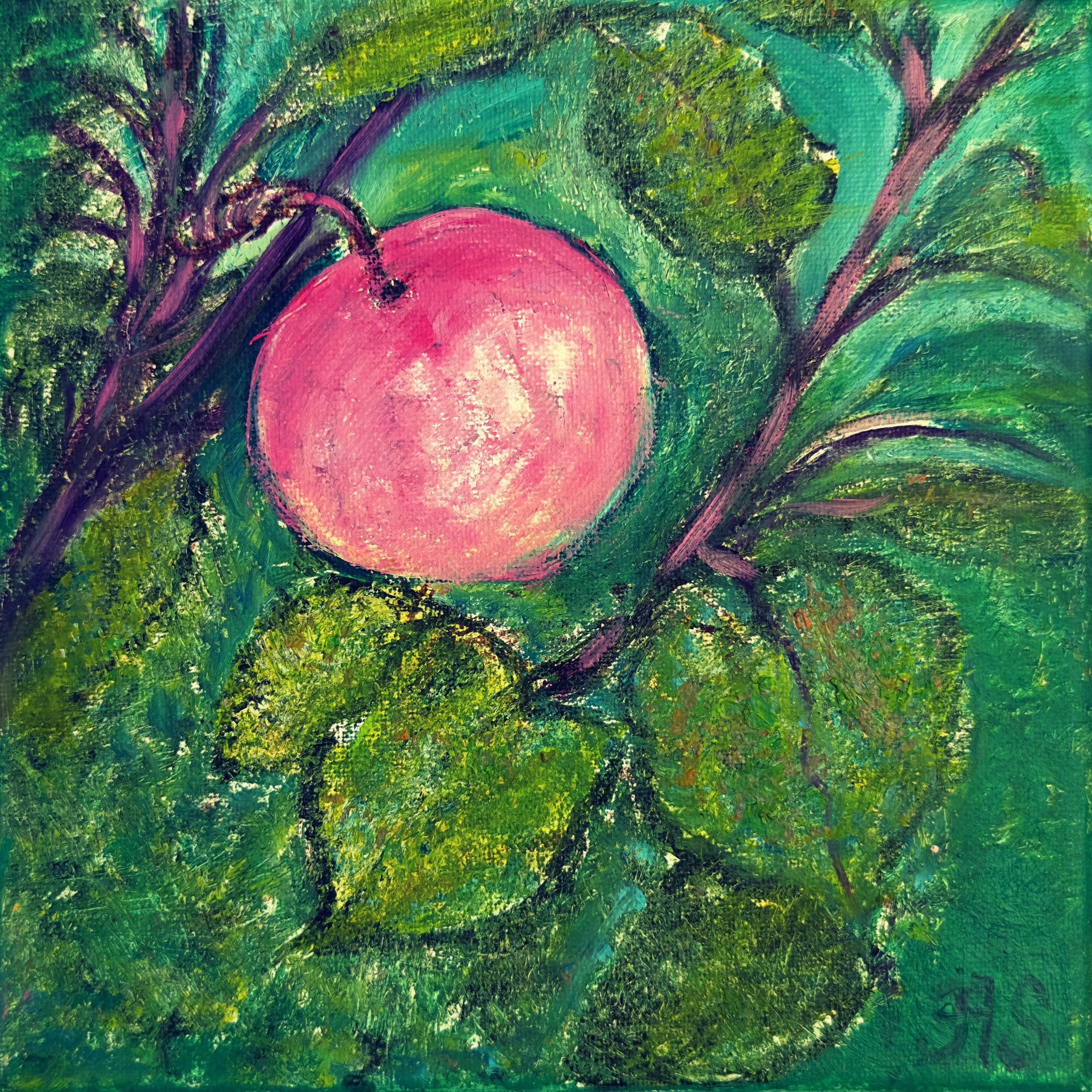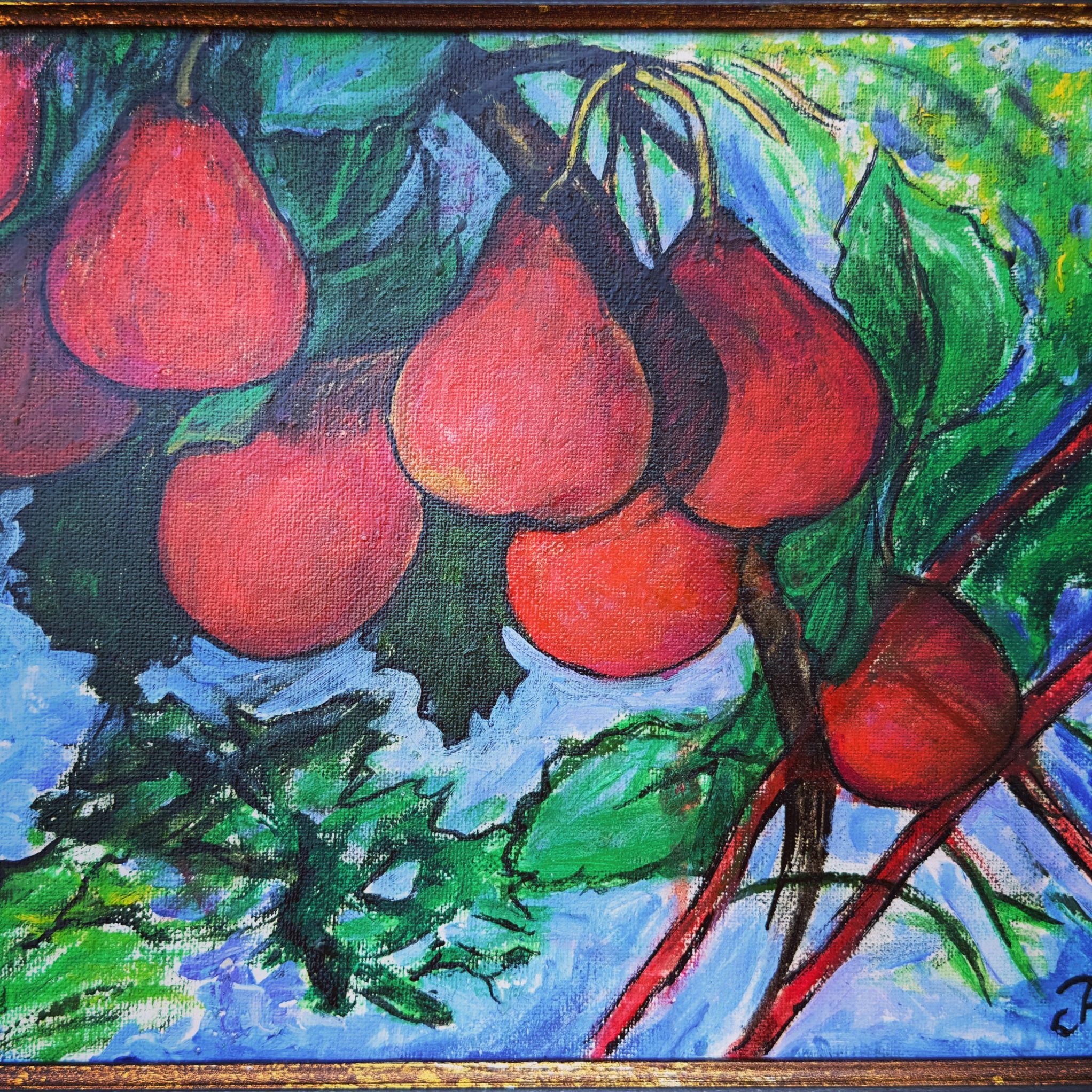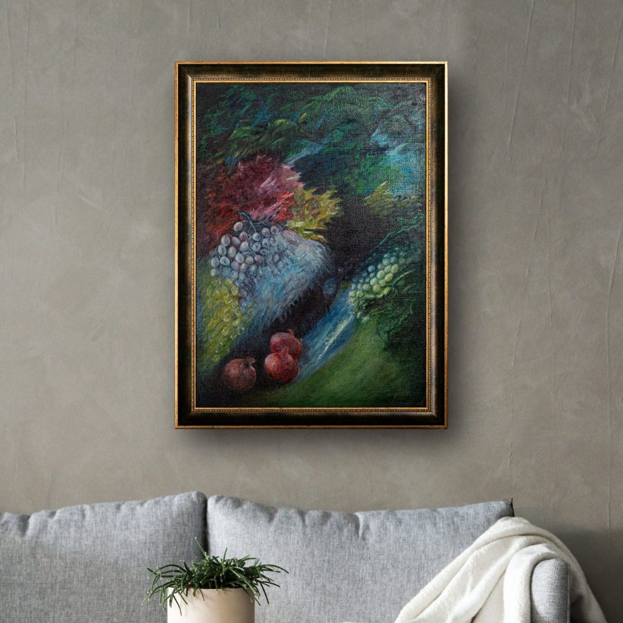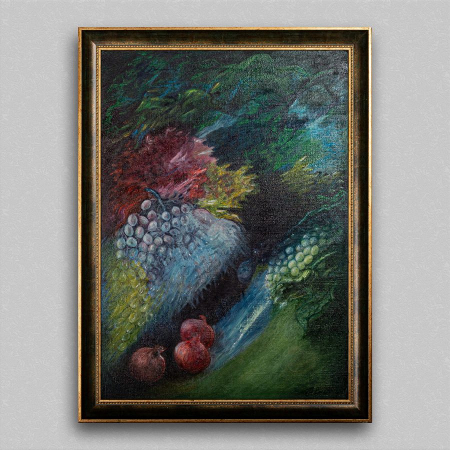 This dream-like still-life is painted in oil on hard cardboard and framed.